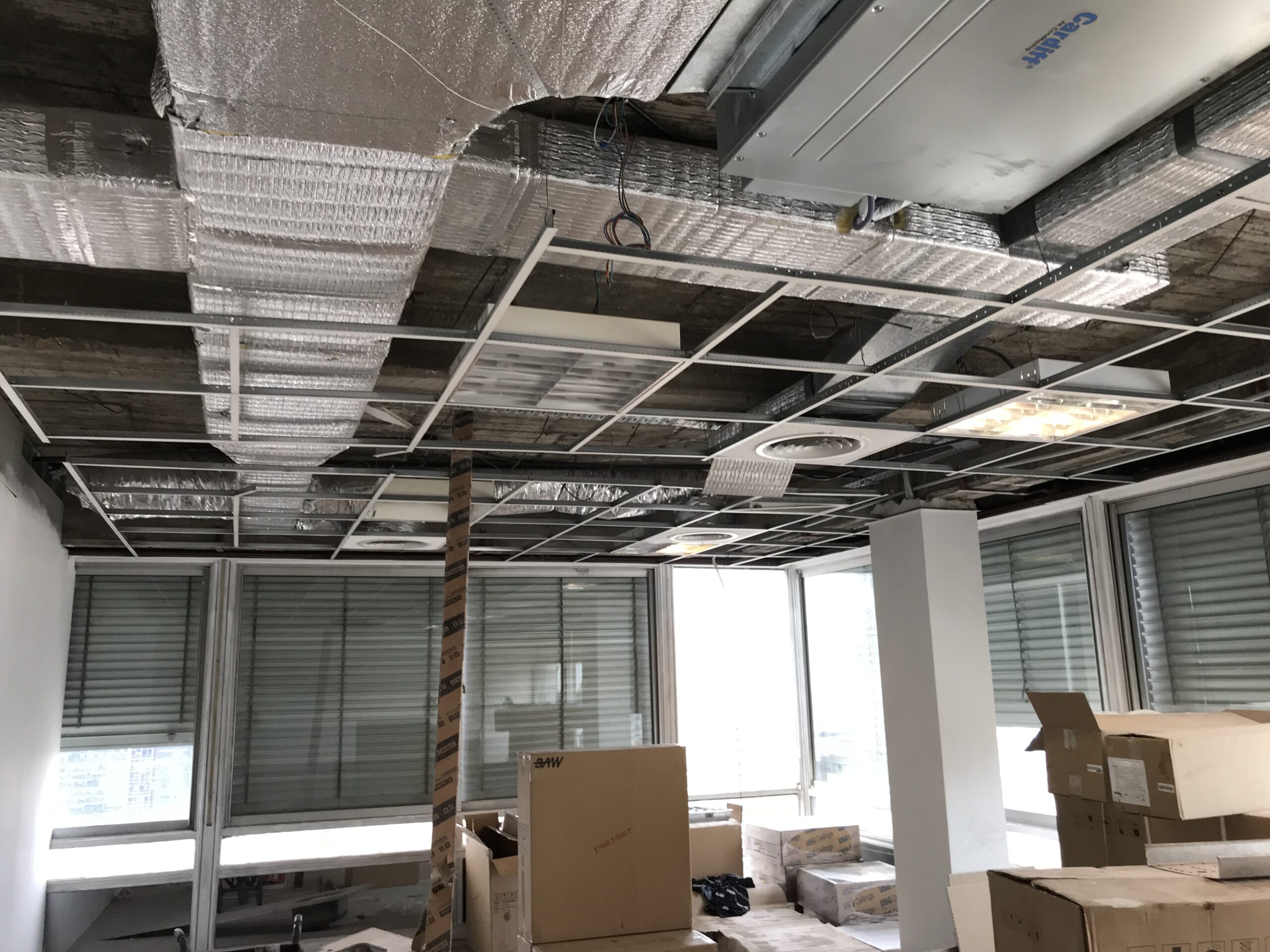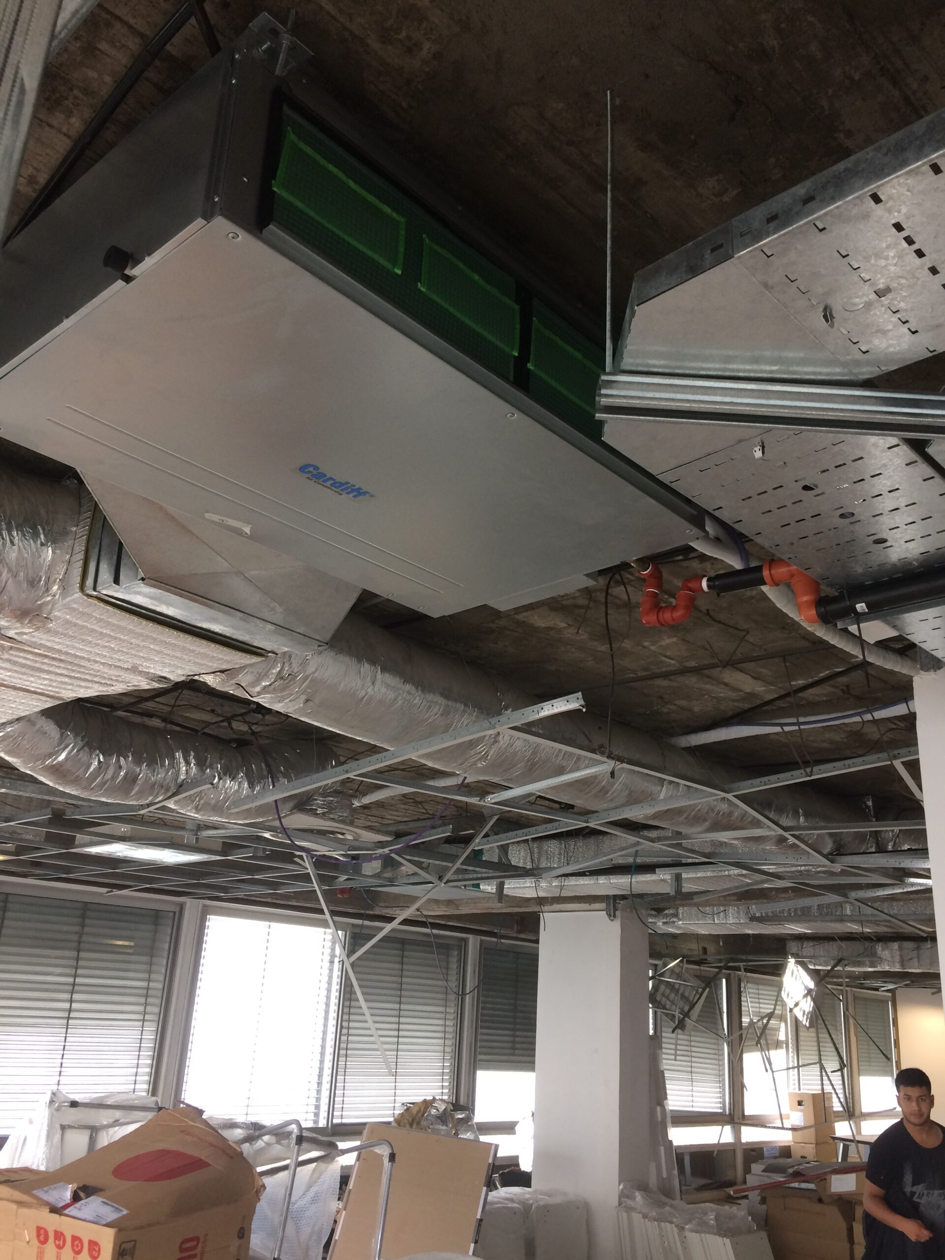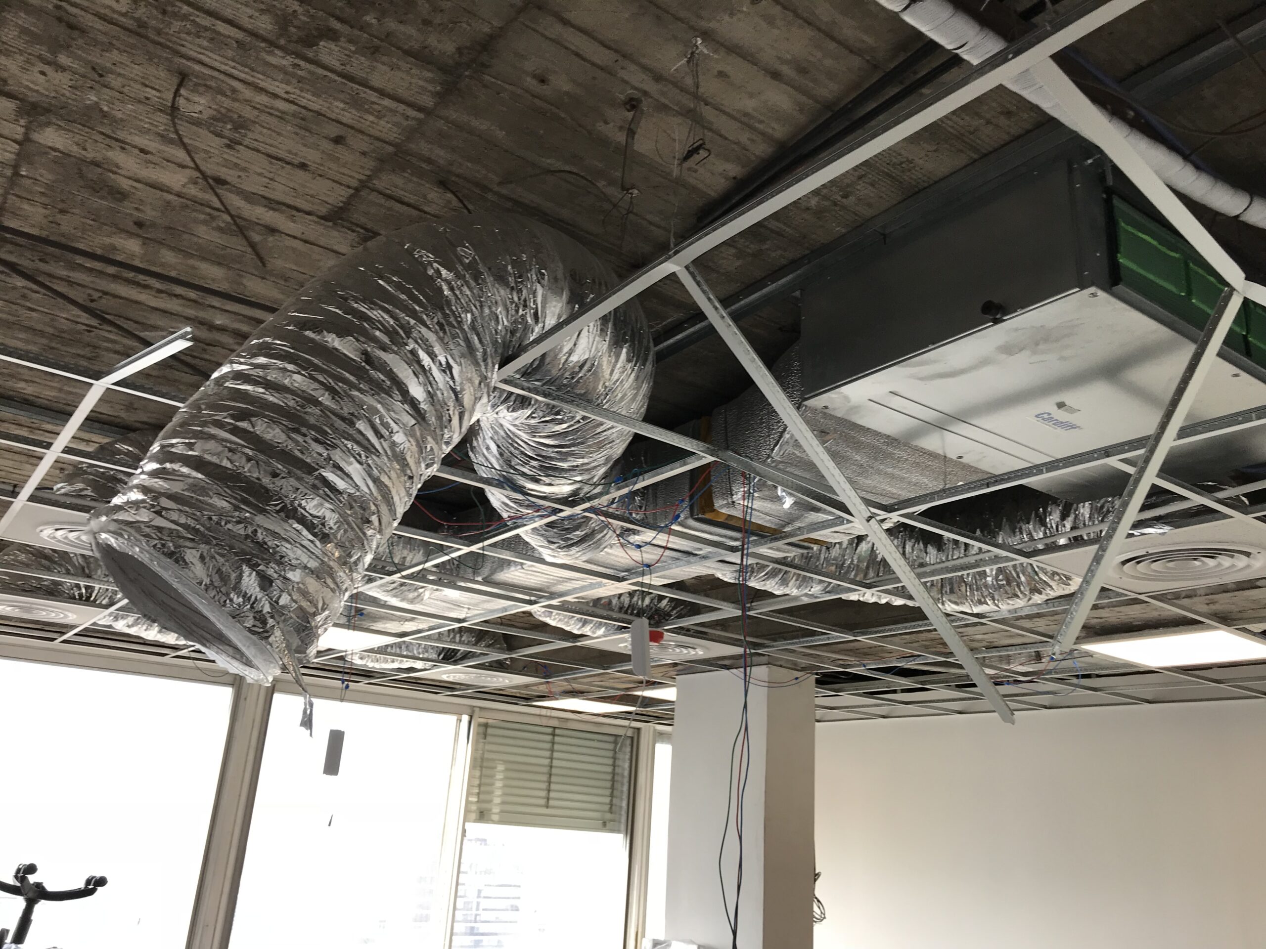Instalación de 14 Aires bajo silueta en 2 pisos de oficinas de personal y gerencia, tendido de conductos, instalación eléctrica y control centralizado.